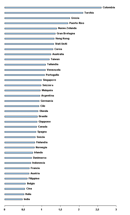 | Nota: in questa analisi, come in quelle che seguono, non sono considerati i paesi dell'ex Unione Sovietica e dell'Europa orientale. Queste informazioni mancano nei sistemi di dati utilizzati, probabilmente perché in seguito ai grandi cambiamenti avvenuti in molti di quei paesi non è possibile, almeno finora, costruire serie storiche coerenti. |