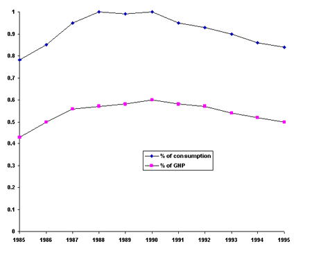 The ratio of advertising to GNP, which was static or decreasing in the Seventies, grew between 1980 and 1988 but has been decreasing since 1990. Family consumption decreased, in real terms, in 1993; it is slightly recovering since 1994, but with slower growth than GNP.